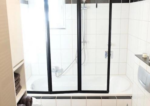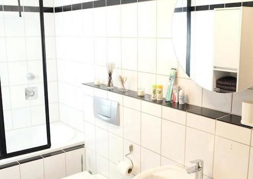 Im Badezimmer erwartet Sie eine helle Atmosphäre mit Badewanne inkl. einer stabilen ausklappbaren Duschwand und einer Überkopf-Regendusche.