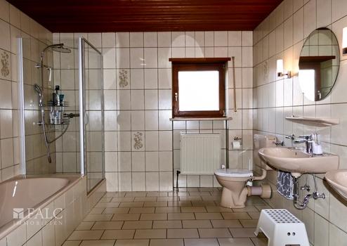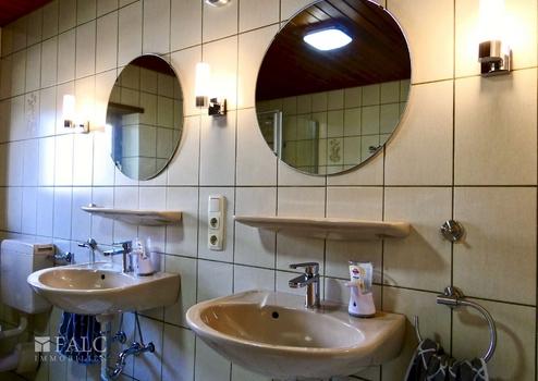 - Badezimmer mit Badewanne, Dusche, WC, Bidet, 2 Waschbecken, Fenster