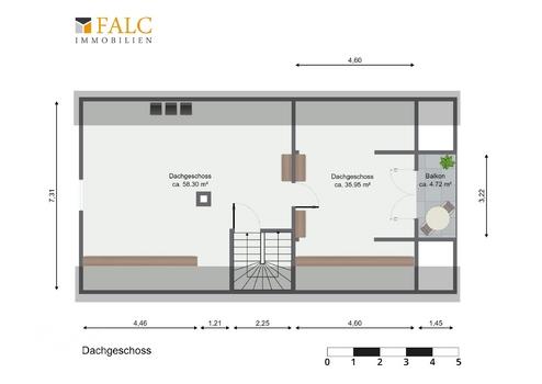 Das teilausgebaute Dachgeschoss mit Balkon ist isoliert und kann durch Vollendung in ein Home-Office oder Wohnraum für Ihre Familie bieten.