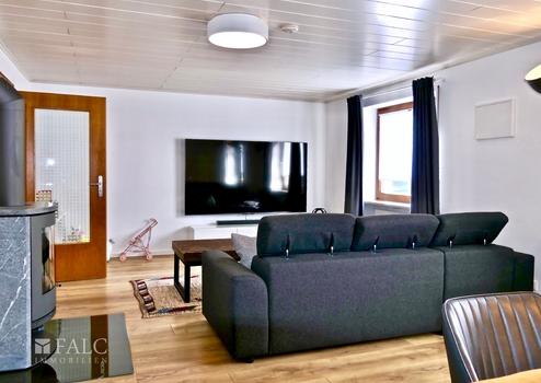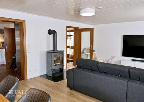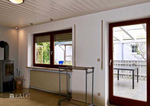 - Wohnzimmer, ca. 18,44 m²; mit Schweden-Speckstein-Holzofen(ca. 5,0 KW/h, mit Zugang überdachter Terrasse