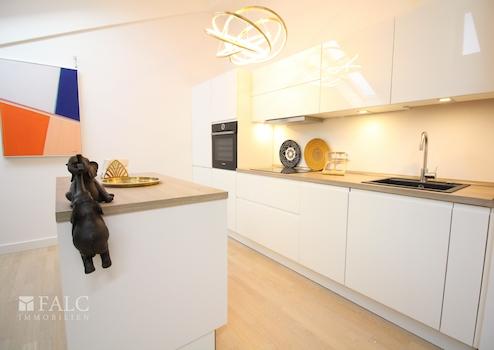 Der großzügige, lichtdurchflutete Wohnbereich mit offener Küche lädt zum Entspannen und Verweilen ein. Die großen Fenster sorgen für eine helle und freundliche Atmosphäre. Die moderne und stilvoll integrierte Küche mit hochwertigen Einbaugeräten ist der perfekte Ort, um kulinarische Kreationen zu verwirklichen.
