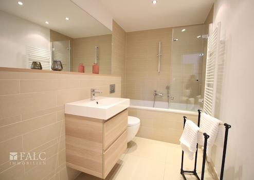 Das Badezimmer ist mit hochwertigen Armaturen und einer komfortablen Badewanne ausgestattet. Ein zusätzliches Gäste-WC sorgt für höchsten Wohnkomfort.
