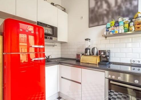 + Im Wohnzimmer findest du einen gemütlichen Sitzbereich mit einem Ledersofa, Sessel, ein Smart-TV und einem großen Essbereich an einem Designer Eichentisch. + Die Küche ist natürlich voll ausgestattet mit SIEMENS Herd und Backofen, SMEG Kühlschrank, BOSCH Spülmaschine und Wasserkocher und allem, was du sonst brauchst, um lecker zu kochen.