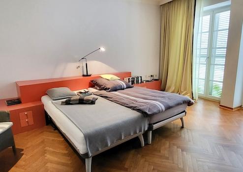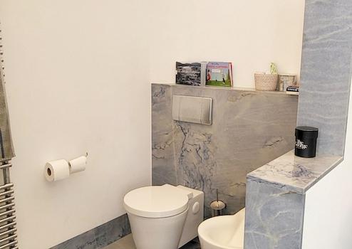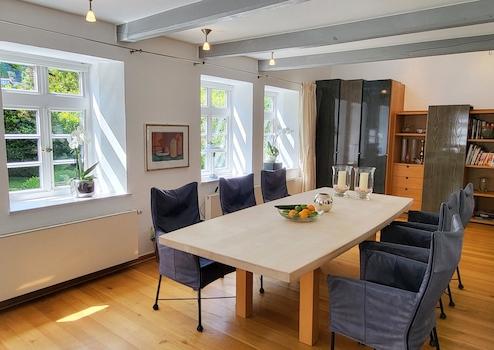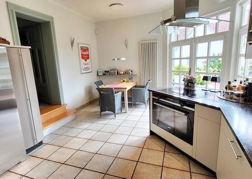 Der Elternbereich im Erdgeschoss mit Schlafzimmer und einem riesigen Badezimmer mit Ankleidebereich sucht von Größe und Ausstattung her seinesgleichen. Im Jahr 2022 wurde eine hochwertige neue Küche installiert. Die Wohndiele mit 3,70 Meter hohen Decken ist hell und freundlich, mit sehr schönen offenen Balken und einem offenen Kamin. Der Gästebereich mit eigenem Schlaf- und Badezimmer liegt ruhig im Seitenflügel.