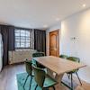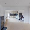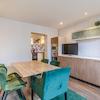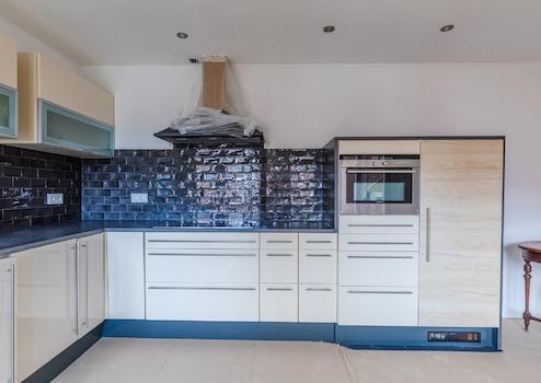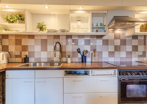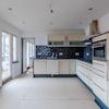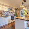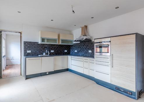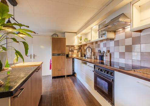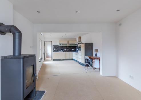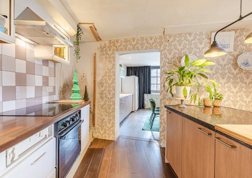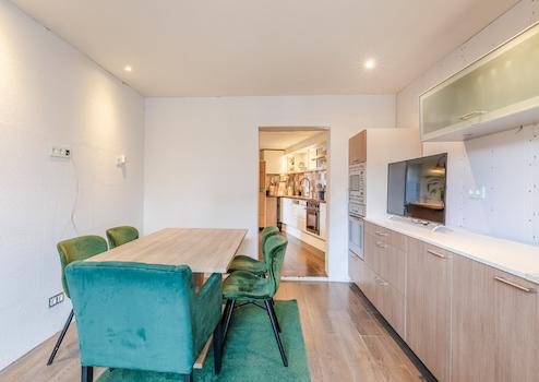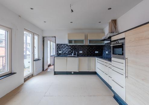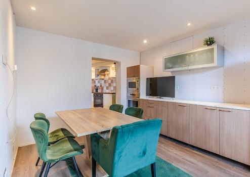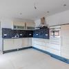 Halboffene Küche mit Einbauküche inkl. Einbaugeräten.