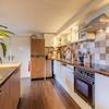 Halboffene Küche mit Einbauküche, Kochinsel/Bar und Einbaugeräten.