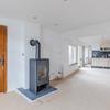Wohnzimmer mit Holzofen und Klimaanlage.