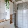 Badezimmer mit Dusche, Waschbecken und Toilette.