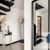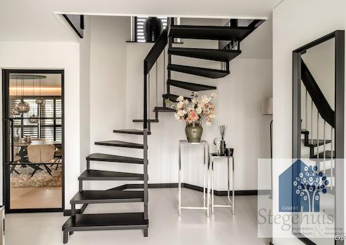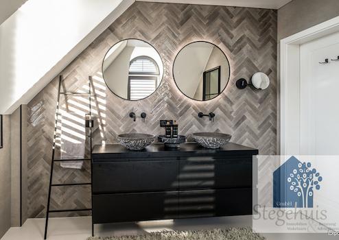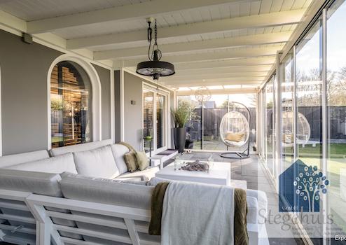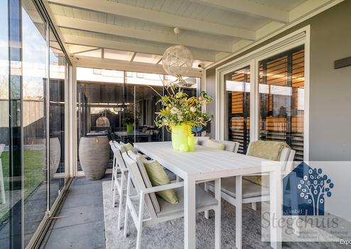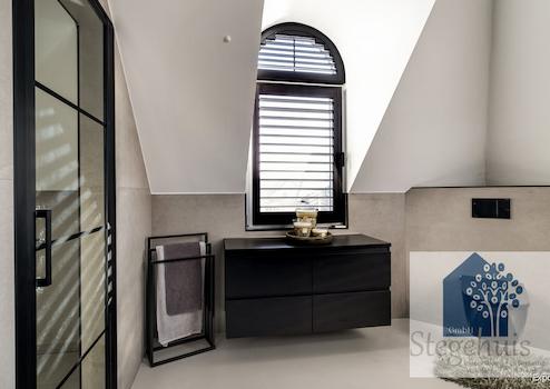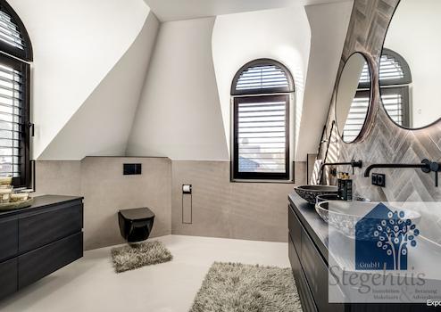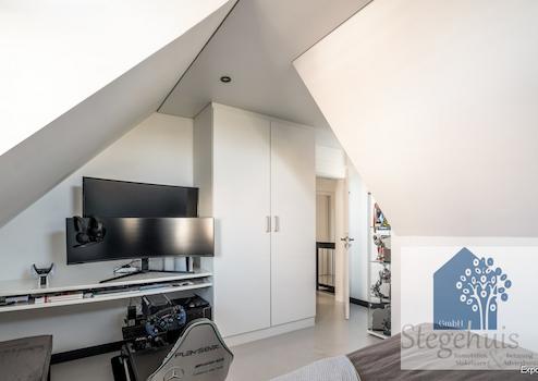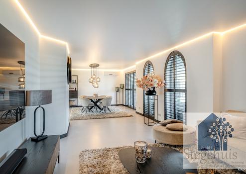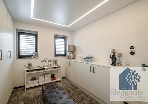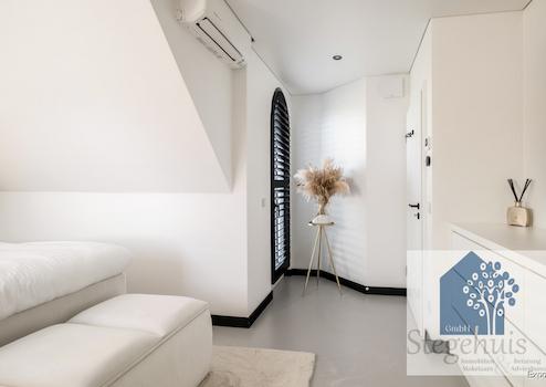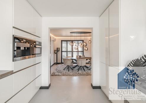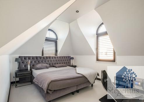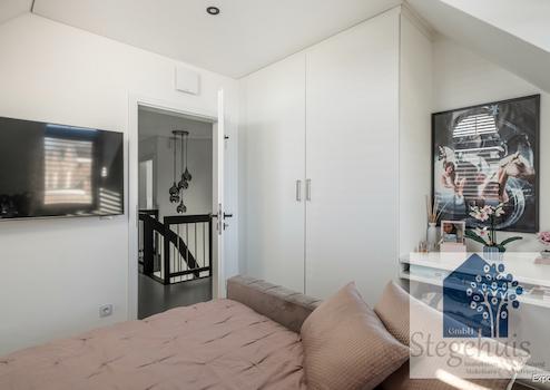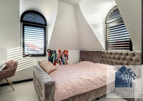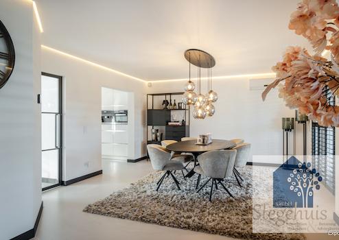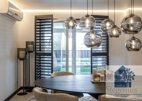Schon beim Betreten der Halle erleben Sie die gesamte hoteleigene Atmosphäre des Hauses; Modern, elegant, aber mit einer warmen, luxuriösen Note. Dies spiegelt sich unter anderem im hier beginnenden Gussboden wider, kombiniert mit den schwarzen hohen Fußleisten, der Stahltür zum Wohnraum und der schwarzen Wendeltreppe in den ersten Stock. Das Gäste-WC befindet sich in diesem Flur und ist mit Dusch-WC, Urinal und Waschbecken ausgestattet. Vom Flur aus gelangt man sowohl in das Wohnzimmer als auch in das erste Schlafzimmer, wobei wir hier mit dem Wohn- und Essbereich beginnen möchten. Darüber hinaus haben Sie von beiden Wohnräumen aus Zugang zum großen, komplett geschlossenen (mittels Glasschiebewand) Wintergarten. Dadurch ist noch mehr Wohnfreude entstanden, bei der Innen und Außen zusammenkommen. Die schöne und luxuriöse halboffene Küche ist mit dem Essbereich verbunden und in neutralen Tönen und ohne Griffe gehalten. Diese moderne Hochglanz-Winkelküche befindet sich im vorderen Bereich und verfügt über diverse Einbaugeräte. Alle Fenster im ganzen Haus verfügen über luxuriöse, maßgefertigte Fensterläden und selbst die Fenstertüren sind nicht zu übersehen. Das Schlafzimmer liegt ebenfalls an der Vorderseite und verfügt über geräumige Einbauschränke.