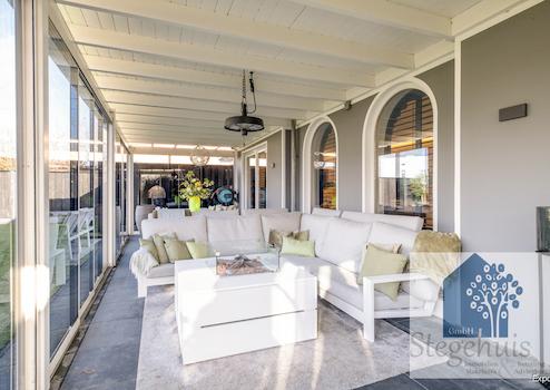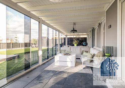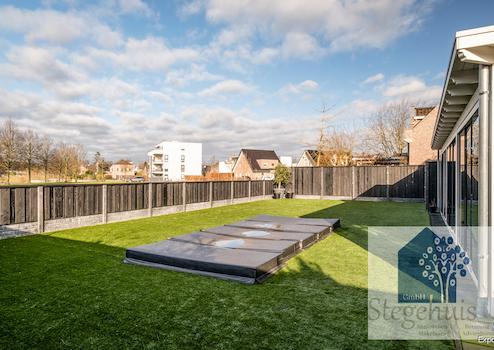 Ein wunderschöner Garten, viele Möglichkeiten zum Genießen und ein großer Wintergarten, der mit einer Glasschiebewand komplett abgeschlossen werden kann. Dies sind bereits einige Vorteile, die mit diesem wunderbaren Ort verbunden sind. Im Sommer können Sie den Swimmingpool genießen und da der Rasen künstlich ist, ist er auch leicht zu pflegen. Durch die einmalige Aussicht können Sie eine Oase der Ruhe und Entspannung in vollen Zügen genießen und in der angeschlossenen Steingarage Ihrem Hobby nachgehen.