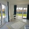 Wohnraum mit Bett, Tisch, Schrank, offener Küche. Sehr hell weil zwei Wände mit Bodentiefen Fenstern.