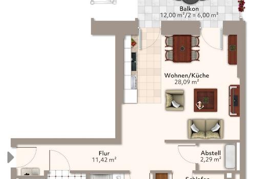Die Wohnung besticht durch ihre durchdachte Raumaufteilung und hochwertige Ausstattung. Der offene Wohn- und Küchenbereich schafft ein einladendes Ambiente, während zwei geräumige Schlafzimmer ausreichend Platz für individuelle Gestaltung bieten. Das Tageslichtbad ist mit einer Dusche und Badewanne ausgestattet und verfügt über einen praktischen Waschmaschinenanschluss.