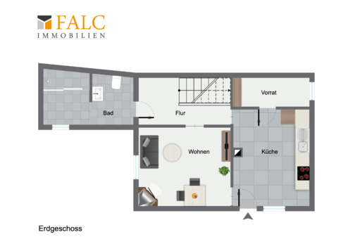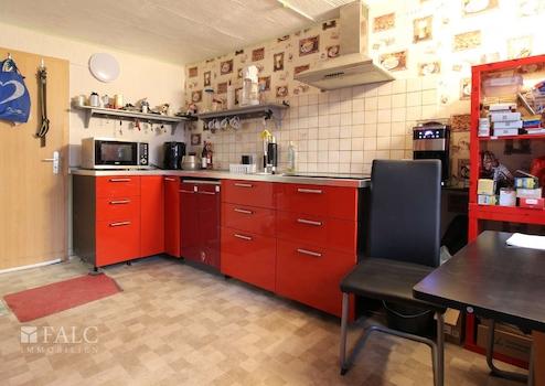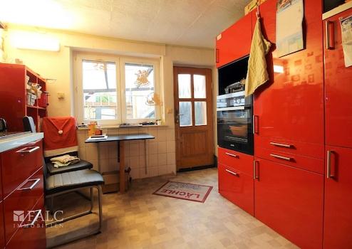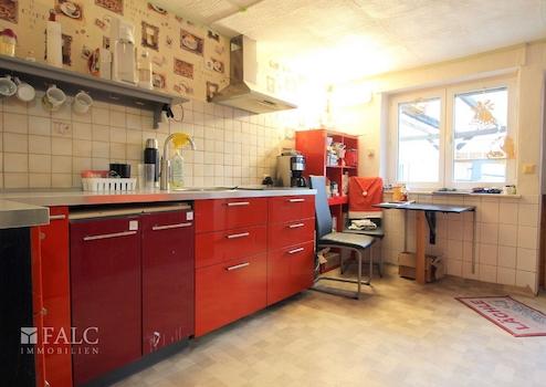 Beim Betreten des Hauses empfängt Sie eine einladende Küche, die im Kaufpreis enthalten ist. Die roten Fronten setzen einen modernen Akzent.