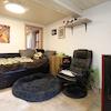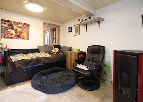 Die Wände im Wohnzimmer sind in neutralen Tönen gehalten, was eine angenehme Atmosphäre schafft. Der Pelletofen sorgt für wohlige Wärme. Das Badezimmer ist praktisch eingerichtet und verfügt über eine Dusche sowie einen Waschmaschinenanschluss. Die hellen Fliesen tragen zur freundlichen Ausstrahlung des Raumes bei.