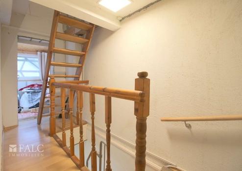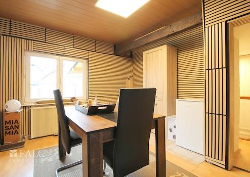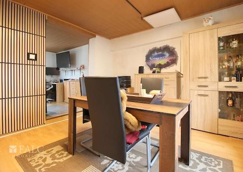 Im Obergeschoss befinden sich das Esszimmer sowie das Schlafzimmer, das durch seine ruhige Lage einen erholsamen Rückzugsort bietet. Der angrenzende Balkon ist als Wintergarten ausgestaltet und lädt dazu ein, den Tag hier mit einem Kaffee zu beginnen.