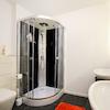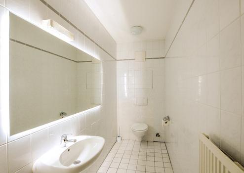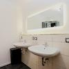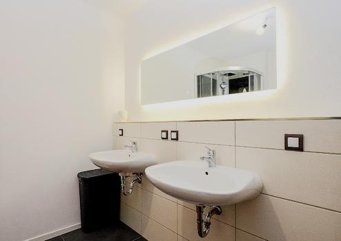 • Badezimmer mit Glasdusche, WC, zwei Waschbecken und Waschmaschinenanschluss