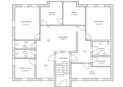• Zwei separate Gäste-WCs, welche zu einem großen Badezimmer ausgebaut werden können
