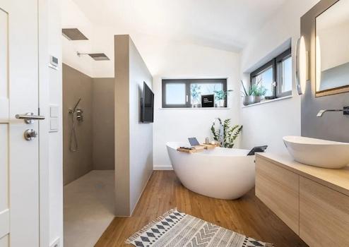 Die gehobene Ausstattung dieses Hauses wird Sie begeistern. Die Verwendung einer modernen Wärmepumpe als Befeuerungsart verbindet umweltfreundliches Wohnen mit hohen Energieeffizienzstandards. Diese Technologie nutzt die natürliche Wärme aus der Umwelt und sorgt somit für niedrige Energiekosten und ein angenehmes Raumklima. Das Objekt erfüllt den KFW40 Standard, was bedeutet, dass es besonders energiesparend ist und Ihnen langfristig Kosten spart. Der Standard-Ausbau 'FastFertigPlus' beinhaltet eine umfassende Sanitär-Grundausstattung, sodass Sie sich um die Bäder in Ihrem neuen Zuhause keine Gedanken machen müssen