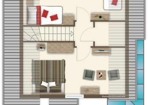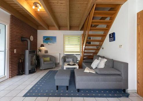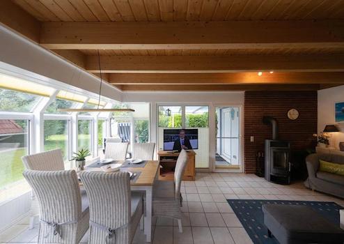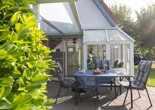 ID012025 Das gemütlich und modern eingerichtete Ferienhaus im Land Wursten zwischen Bremerhaven und Cuxhaven ist mit allem Komfort ausgestattet und wird mit kompletten Inventar verkauft. Das Ferienhaus besteht aus einem großzügigen Wohn-/Essbereich mit Kamin mit EBK, vom hell eingerichteten Wohnbereich geht man in den lichtdurchflutenen Wintergarten. Das Duschbad mit WC befindet sich im EG. Im OG befinden sich zwei Schlafzimmer mit Außenrolläden. Terrasse mit Gartenmöbeln.