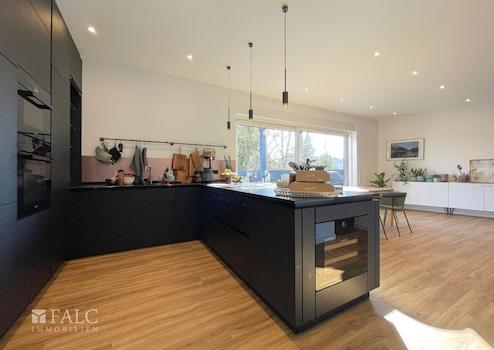 Für mehr Sicherheit und Komfort sorgt eine Gegensprechanlage mit Video-Hausstation, die eine visuelle Kommunikation mit Besuchern ermöglicht. Die Einbauküche stammt von der renommierten Marke Schüller und ist mit erstklassigen Geräten ausgestattet. Dazu gehören das Bora Professional 3.0 Kochfeld mit Edelstahlgrill, ein Miele Weinkühlschrank mit zwei Temperaturzonen, ein Miele Dampfgarer und ein Miele Backofen. Ein Quooker Wasserhahn, der sofort heißes Wasser liefert, ergänzt die Küche ideal.