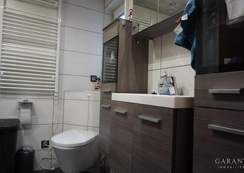 In dem zeitlos schön gefliesten Bad mit begehbarer Dusche gelingt ein guter Start in den Tag.