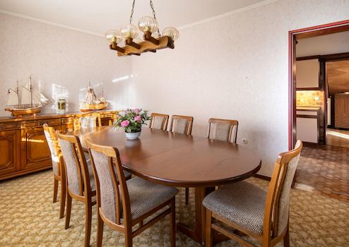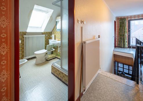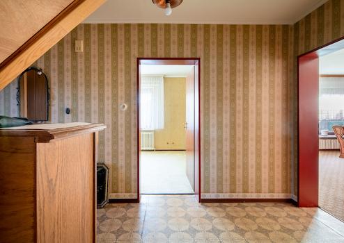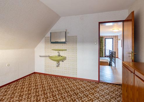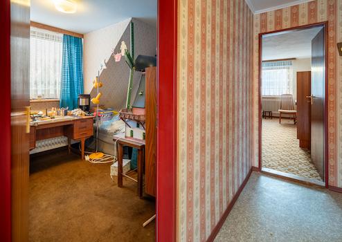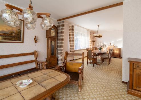 Das Haus wurde 1972 massiv auf dem 941 m² großen Grundstück erbaut und ist inzwischen natürlich sanierungsbedürftig. Wir sehen das als Chance für die neuen Eigentümer, vieles nach eigenen Ideen und neuesten Energiestandards umzugestalten und so ihr Traumhaus zu verwirklichen. Im EG beträgt die Wohnfläche rund 100 m², aufgeteilt in den geräumigen Eingangsbereich, von dem der sehr große Wohnraum (mit Zugang zum Garten), ein geräumiges Schlafzimmer, die Küche mit angrenzendem Flur und Vorratsraum das Bad sowie ein Gäste-WC erreicht werden. Außerdem gibt es noch den Heizungsraum, der über eine Außentüre begehbar ist. Die Treppe im Eingangsbereich führt ins OG. Hier befinden sich auf rund 70 m² der Flur mit Zugang zu 2 kleinen Zimmern (Kinder, Gäste, Arbeiten...), 2 großen Zimmern (Schlafen, Wohnraum, ...), das Bad und die Küche. Wärme und Warmwasser kommen von einer Ölbrennwertheizung (Bj. 2007), der Garten ist fast umlaufend von einer Hecke umgeben und damit nahezu nicht einsehbar. Eine Pkw-Garage mit kleiner Werkstatt ist direkt ans Haus gebaut.