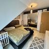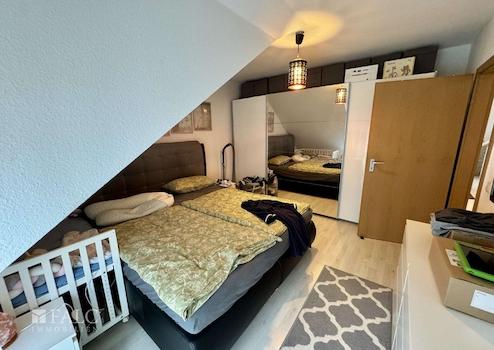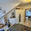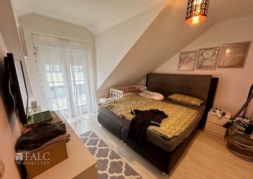 Das Schlafzimmer bietet Platz für ein großes Bett und Stauraum für Kleidung. Die schrägen Wände verleihen dem Raum Charakter und Gemütlichkeit.