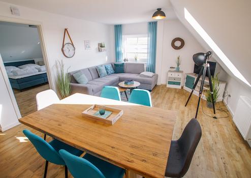 Voll ausgestattet, Platz für vier Personen und direkt am Nordseedeich. Das sind nur einige Merkmale dieser modernen Wohnung in Tossens. Geheizt wird mittels Gasheizung. In der großzügigen Wohn-Essküche gibt es alles, was das Herz begehrt: Spülmaschine, Toaster, Kaffeemaschine etc. Der Wohnbereich verfügt über Flatscreen-TV und gemütlicher Wohnlandschaft auf der man sich nach einer Wattwanderung oder einer Fahrradtour ausruhen kann. Zu jeder Wohnung gehört außerdem ein Schuppen mit E-Fahrradladestation sowie PKW-Stellplätze.