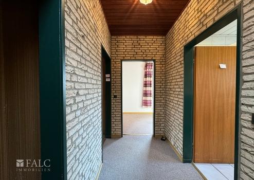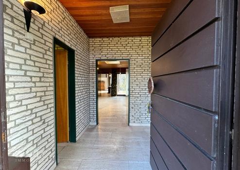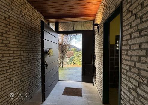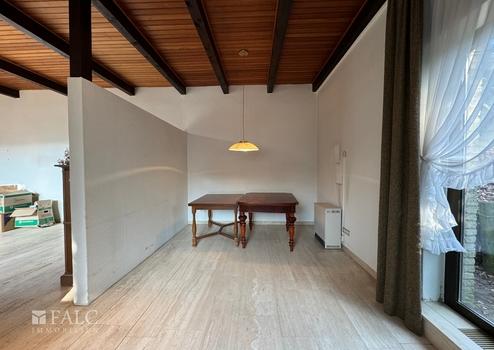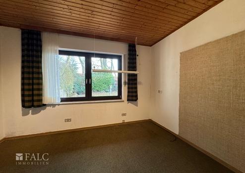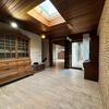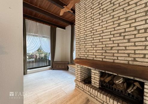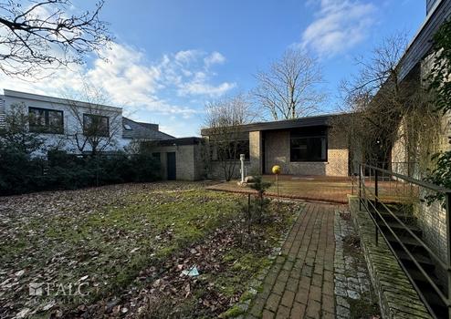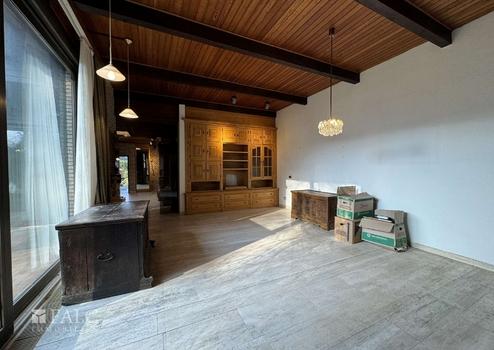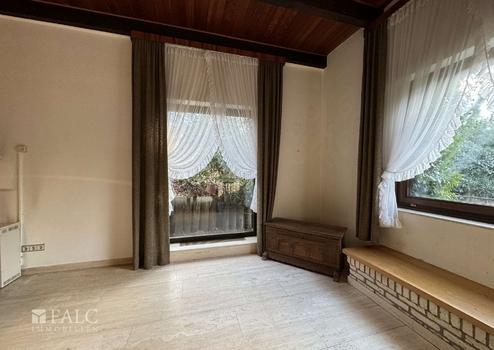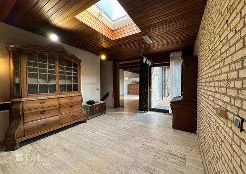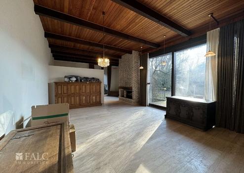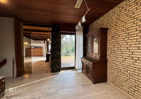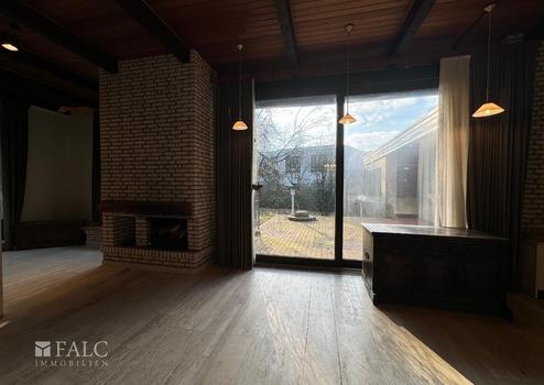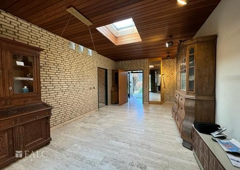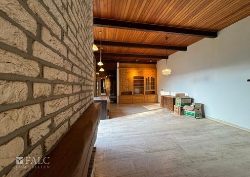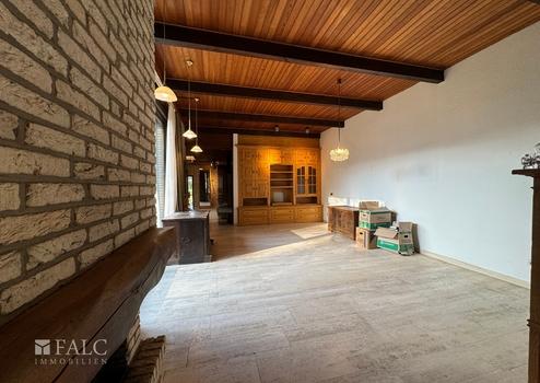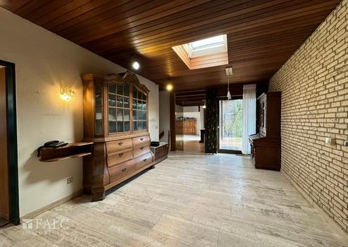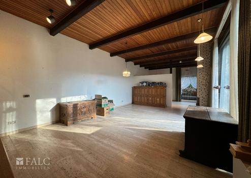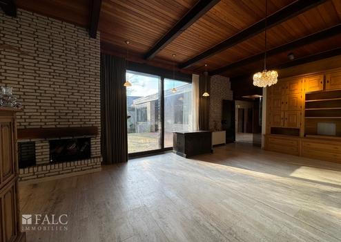 Willkommen in diesem großzügigen freistehenden Einfamilienhaus, das mit einer Wohnfläche von ca. 180 m² viel Platz für individuelle Gestaltungsmöglichkeiten bietet. Der Eingangsbereich besticht durch seine offene Gestaltung und führt direkt in das helle Wohnzimmer. Hier fällt das Licht durch große Fensterfronten, die den Raum mit natürlichem Licht durchfluten und einen angenehmen Ausblick auf den Garten bieten. Die Decken sind mit Holz verkleidet, was dem Raum eine warme und einladende Atmosphäre verleiht.