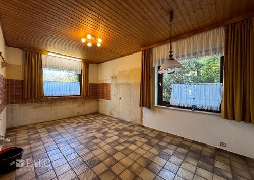 Die Küche ist geräumig und bietet ausreichend Platz für eine moderne Kücheneinrichtung. Die Fliesenböden sind pflegeleicht und robust, ideal für den täglichen Gebrauch. Ein separates Gäste-WC ist ebenfalls vorhanden, was den Komfort für Besucher erhöht.