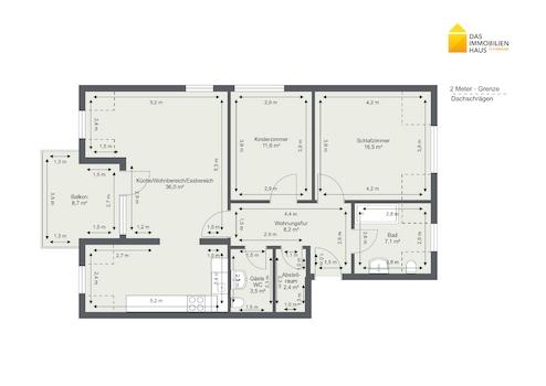 Aufteilung: Flur, Abstellraum, Wohnzimmer mit offener Küche und Zugang zum Balkon, Kinderzimmer, Schlafzimmer, Bad, Gäste-WC