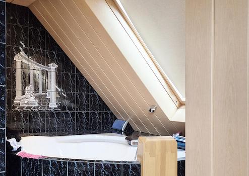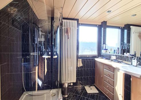 Über eine Treppe gelangen Sie in das Dachgeschoss. Hier befindet sich das großzügige Schlafzimmer, dass ebenfalls mit offenen Sichtbalken eine ganz besondere Atmosphäre schafft. Das Familienbad verfügt über einen traumhaften Ausblick in Richtung Neckar und bietet zudem eine schöne Eckbadewanne und eine große Dusche. Durch ein separates WC mit Waschbecken gibt es beim Entspannen keine lästigen Störungen. Ein Abstellraum komplettiert das Raumangebot auf dieser Ebene, der natürlich auch als zusätzliches Schlafzimmer nutzbar gemacht werden kann.