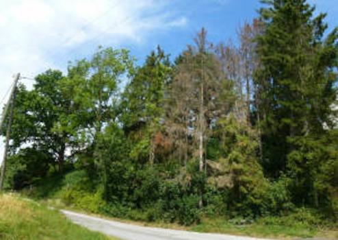 zwischen zwei Grundstücken. Das Grundstück wurde in 2023 komplett gerodet, mittlerweile ist es wieder mit Sträuchern bewachsen, die ein Bagger problemlos entfernen könnte, sobald dort erneut Erdarbeiten aufgenommen werden.