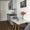 Die Pantryküche u.a. mit Mikrowelle, Wasserkocher, Nespresso-Kaffeemaschine und Esstisch befinden sich im restlichen Teil des Apartments.