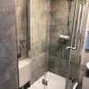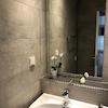 Das Badezimmer mit Dusche, WC, Waschbecken und einem großen Spiegel ist modisch gestaltet.