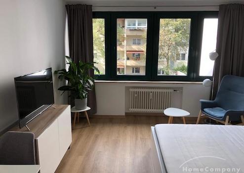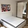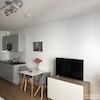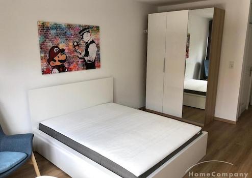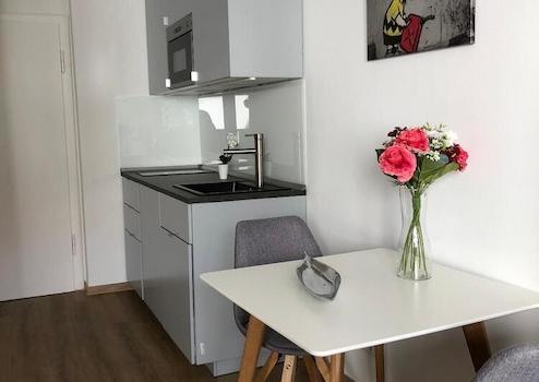 Absolut hell durch die große Fensterfront, ruhig gelegen, mit Aufzug, im 2. Obergeschoss. Ein kombinierter Wohn- und Schlafraum mit einem 160er Bett, 43 Zoll-Flachbildfernseher, Google Speakern, Esstisch, Kleiderschrank, hochwertigem Vinyl-Boden und einer integrierten, voll ausgestatteten Pantryküche.