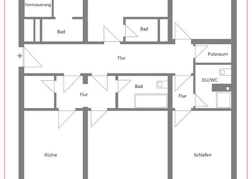 Daher verteilen sich auf die Wohnung vier Nassräume, hierunter gibt es ein Badezimmer mit Badewanne und ein Dusch-WC. Die restlichen Nassräume wurden als Abstellräume genutzt.