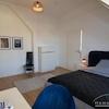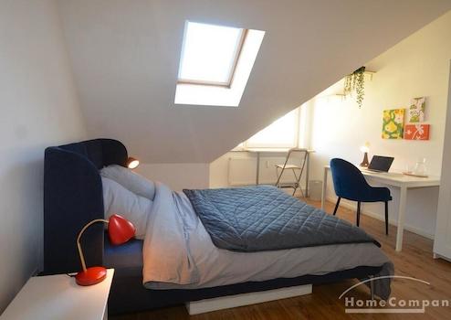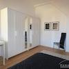 Das Schlafzimmer ist großzügig geschnitten und mit einem bequemen Doppelbett, zwei Schreibtischen und einem geräumigen Kleiderschrank ausgestattet – perfekt für Paare oder Berufstätige im Homeoffice.
