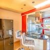 Die offene Küche mit Fenster und Einbauküche hat einen Fliesenspiegel. Ausgestattet ist die moderne Einbauküche mit Cerankochfeld, Backofen, Geschirrspüler, Dunstabzugshaube, Spüle, Ober- und Unterschränken, einem Tresenbereich mit Sitzplätzen sowie einem großen Side-By-Side Kühlschrank mit separaten Kühl- und Gefrierbereich.