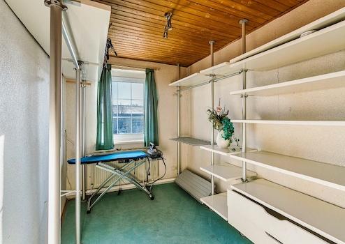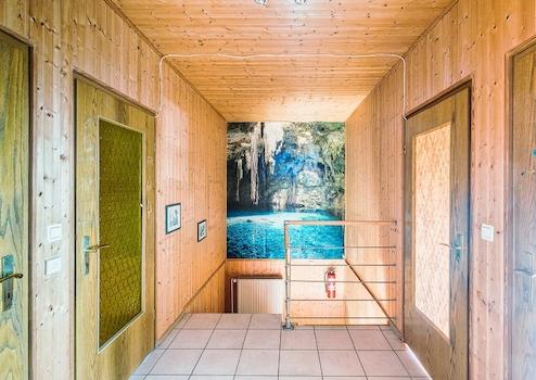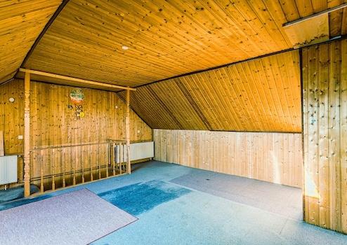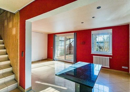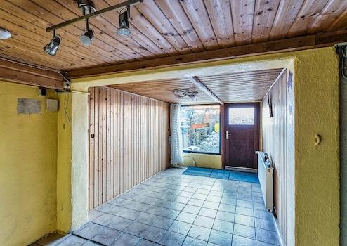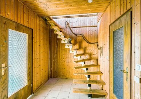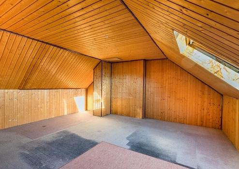 Eine helle Holzverkleidung an den Wänden finden Sie im Flur, im Souterrain sowie auf dem Dachboden. Die beiden Zimmer im OG sind mit Laminatboden, das Ankleidezimmer und das Studio im DG sind mit Teppich ausgelegt. Im gesamten Flurbereich und im Keller sind Fliesen verlegt.
