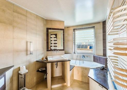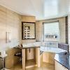Das sanierte, raumhoch geflieste Badezimmer mit Fenster ist mit Badewanne mit Massagefunktionen, WC, Waschbecken sowie einem beheizbaren Handtuchhalter ausgestattet.