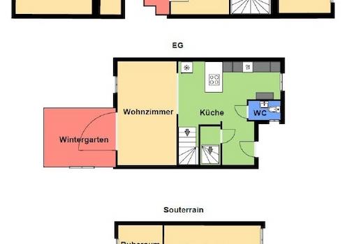 Im Erdgeschoss erwartet Sie eine offene Küche, ein großzügiger Wohn- und Essbereich mit direktem Zugang zum Wintergarten und zur Terrasse sowie eine Gästetoilette. Das Obergeschoss beherbergt ein Schlafzimmer mit Austritt auf den Balkon, ein weiteres Zimmer, das Bad, und ein separates Ankleidezimmer. Das große Dachgeschoss ist als Studio ausgebaut. Im Souterrain gibt es einen Raum mit separatem Eingang mit Schaufenster, welcher bisher als Gewerberaum für eine Vermittlungsagentur genutzt wurde. Dieser Raum eignet sich hervorragend als Kosmetikstudio, Versicherungsbüro, Fußpflege o.ä.. Außerdem gibt es einen Wellness-Sauna-Raum mit Ruheraum, den Heizungsraum und einen Lagerraum mit separaten Zugang zum Gartenbereich.