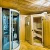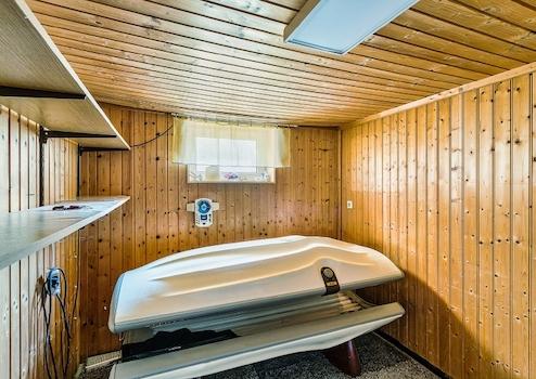 Im Wellnessraum finden Sie Entspannung in der eigenen Aufguss-Sauna mit Elektroofen und in der Wellness-Dusche mit verschiedenen Funktionen. Im benachbarten Ruheraum steht eine Solarbank.