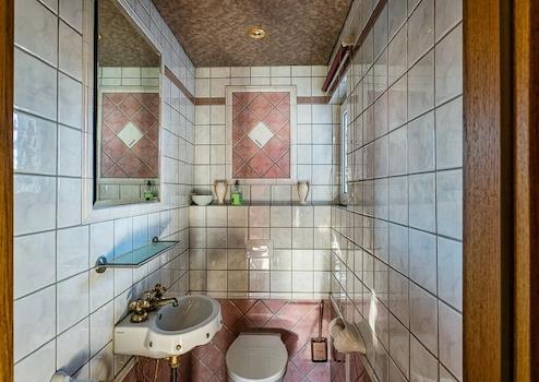 Die Gästetoilette im EG mit Fenster, WC und Waschbecken besticht durch hochwertige Fliesen, die bis zur Decke reichen und dem Raum ein modernes Ambiente verleihen.