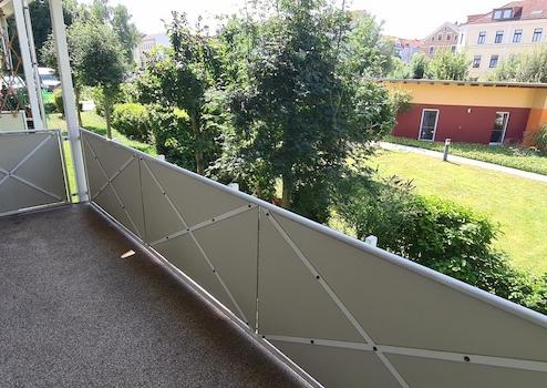 Vom Balkon aus hat man einen Ausblick nach Westen auf eine grüne Oase.