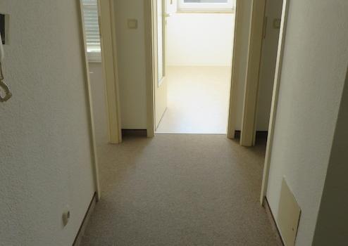 Im Wohnzimmer, Schlafzimmern und Flur wurde Teppichbelag verlegt, in der Küche PVC-Belag. Die Wände sind mit Raufasertapete tapeziert und weis gestrichen.