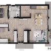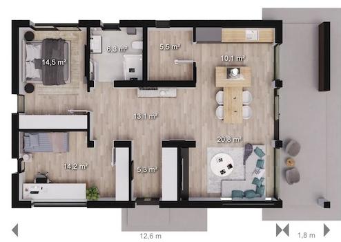 Auf nur einer Ebene befinden sich drei Zimmern, offener Küche, Bad, Technikraum und Diele.