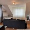 Der großzügige Wohnraum beinhaltet einen großen Esstisch, ein gemütliches Schlaf-Sofa und ein französisches Bett, das tagsüber als zusätzlicher Sitzbereich genutzt werden kann. Ein großes Flatscreen-TV-Gerät und ein Kamin, der mit Brennpaste betrieben wird, sorgen für die Abendunterhaltung. Ein geräumiger, hofseitig gelegener Balkon ermöglicht das Dinner im Freien.