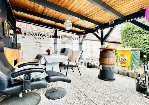 Von diesem Raum haben Sie sowohl Zugang zur teilüberdachten befestigten Gartenterrasse mit angrenzendem angelegten Gartenbereich als auch zur Garage.