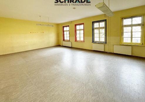 Das Hauptgebäude zeigt sich mit einem zweigeschossigen, teilweise unterkellertem Fachwerkhaus (Baujahr um 1900), in dem auch das Dachgeschoss komplett zu Betreuungs-bzw. Wohnzwecken ausgebaut ist. Eine bequeme Echtholztreppe verbindet beide Ebenen. Jede Ebene verfügt über sanitäre Einrichtungen, der letzten Nutzung angepasst. Die Unterkellerung ( ca. 52 m²) kann als Lagerfläche genutzt werden.